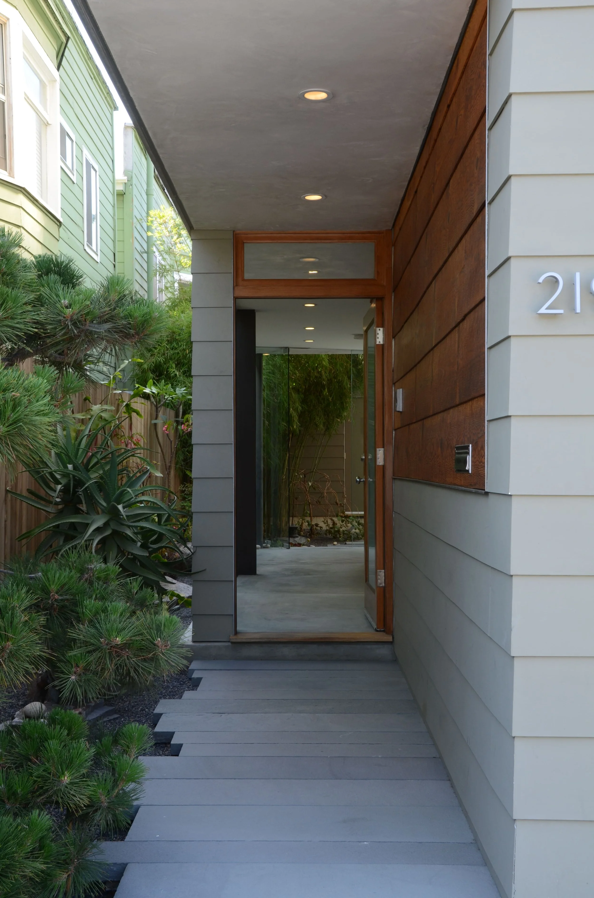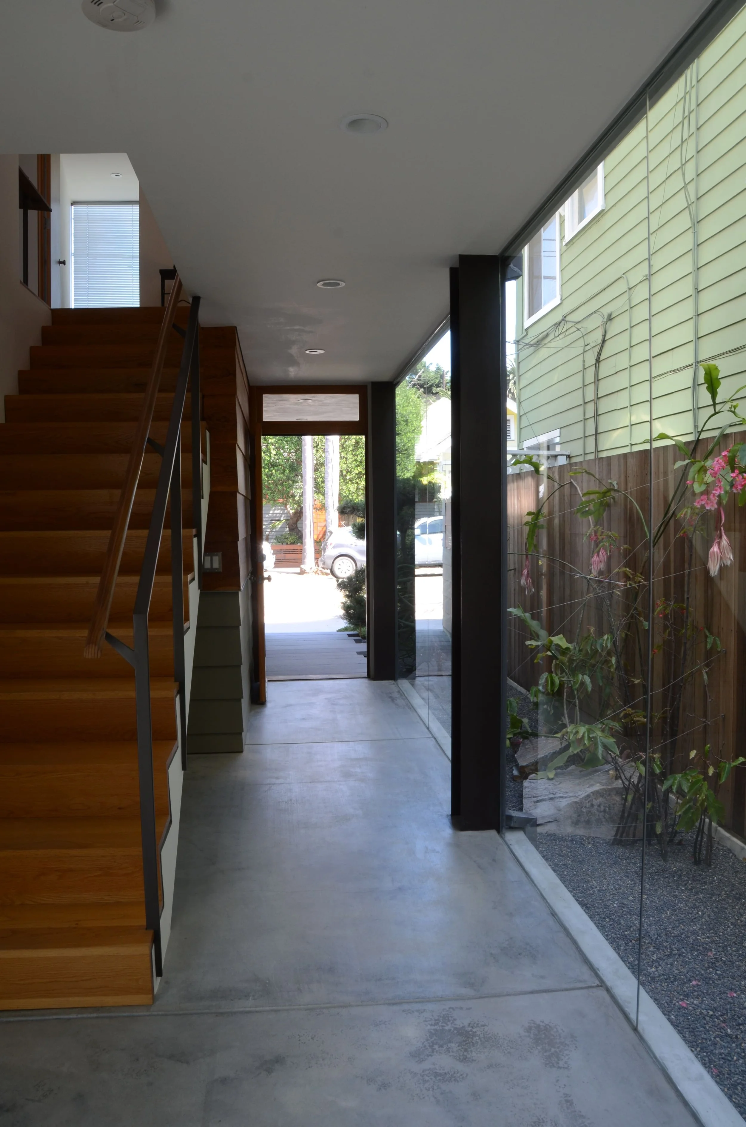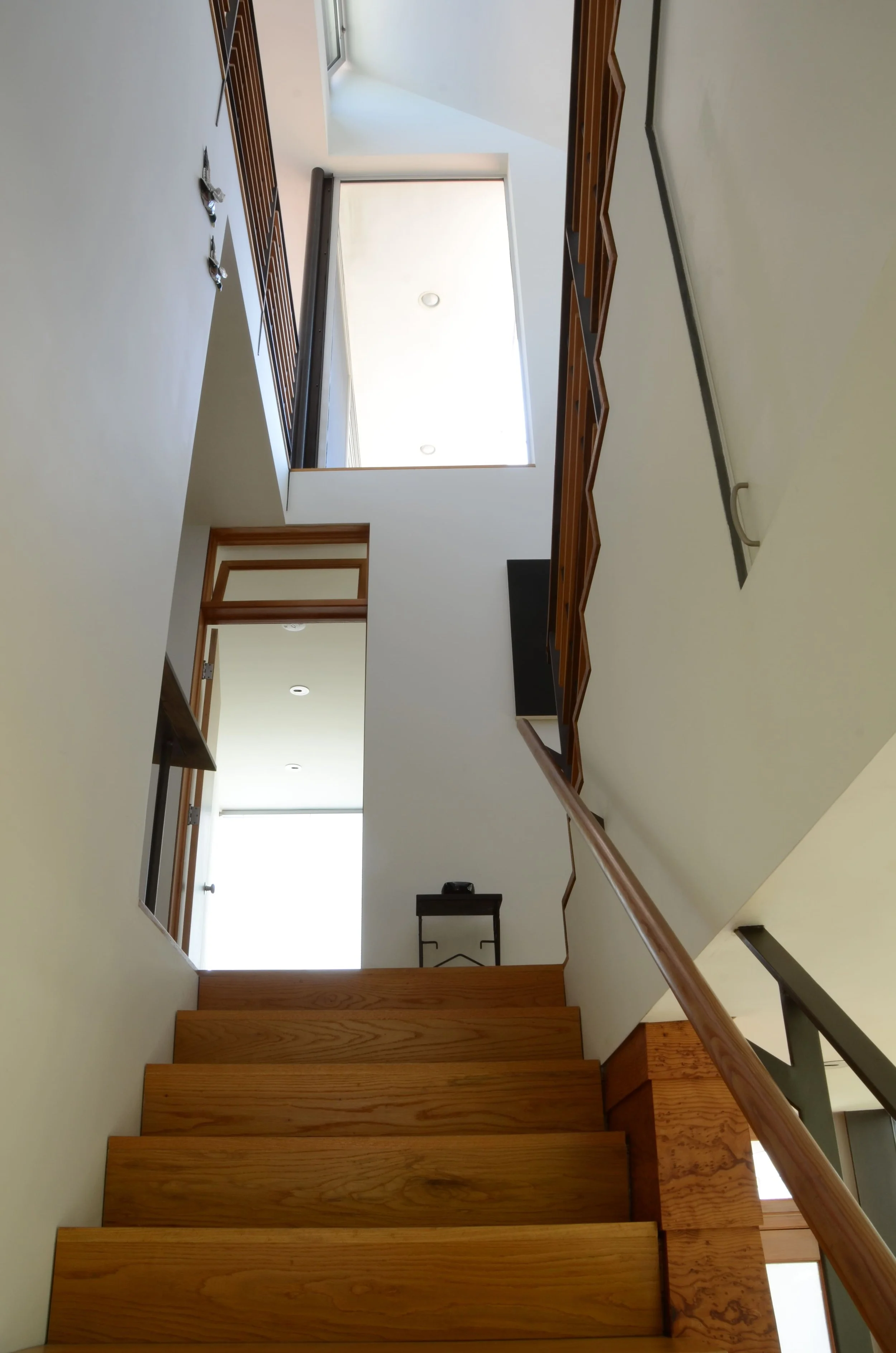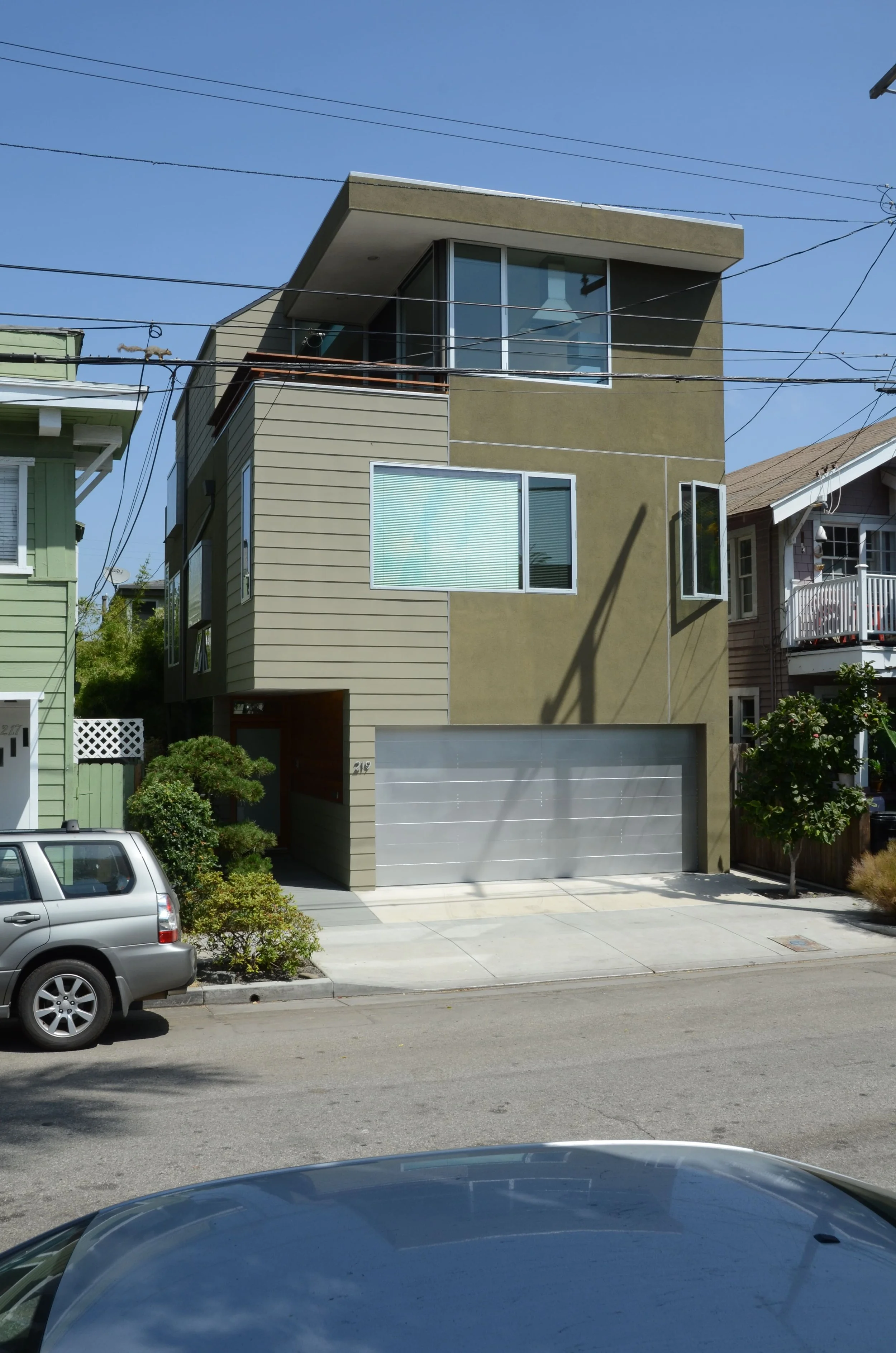 The remainder of the site was developed into a three story, three-bedroom, 1,700 square foot residence and office, also with a two car garage. The living level is on the third story, and with it’s two outdoor decks affords sweeping views and light, while allowing for privacy and quiet. Exterior materials and design echo the largely craftsman nature of the surrounding residences, but in a contemporary manner. This residence uses less energy than the original 625 square foot residence on the property. Both residences live much larger than their compact sizes. Exterior materials consist of painted mitered cement lap siding, stucco, wood decks, metal trim, exposed steel frame, and aluminum windows. Interior materials consist of hardwood, terrazzo, and polished concrete floors, oak cabinetry, ceramic tiled bathrooms, pine and painted cement lap siding, metal railings, and painted drywall.
